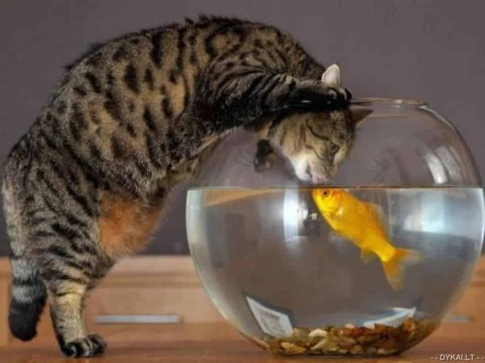 За рыбками кошка, подобно людям, может наблюдать часами. Время от времени она, забавно наклонив голову, водит лапкой по стеклу, Такая виртуальная рыбалка никому вреда не причинит. Но однажды кошка сунет лапку в воду и молниеносным движением выловит рыбку. При этом муркой движет исключительно любопытство и стремление развлечься, а никак не голод. Достав рыбку, кошка немного поиграет ней, а затем сядет рядом, и с довольным видом, будет дожидаться хозяина: посмотри, мол, какая я ловкая! В то же время плотно закрытый аквариум надёжно защитит рыбок. И просто положить стекло поверх аквариума недостаточно: кошка может его сдвинуть. Лучше выбрать современный вариант с надёжной крышкой. В этом случае у кошки в период вашего отсутствия будет отличное шоу, в котором не пострадает ни одна рыбка.